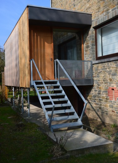 Création d’un volume intermédiaire en ossature bois, bardage ajouré en Padouck Réalisation de l’habillage intérieur en plaque de plâtre, mobiliers sur mesure en Padouck et MDF laqué. Accès à l’étage par un escalier en structure métallique laquée en blanc, marches en Padouck